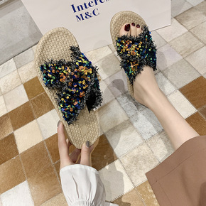 花朵拖鞋女夏2019新款平底亚麻凉拖外穿复古民族风...
