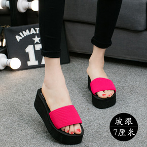 跨境沙滩拖鞋女夏外穿厚底高跟凉拖女海边花朵坡跟人字...