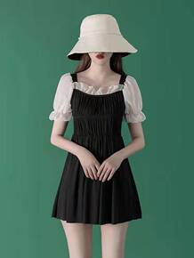 厂家批发2021年新款连体胸前抽褶大小胸显瘦遮肚泡...