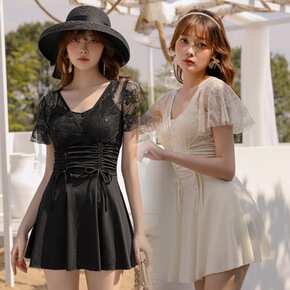 大码泳装女200斤连体裙式显瘦遮肚性感蕾丝短袖V领...