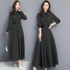 实拍2020秋季新款波点大摆修身系腰带显瘦连衣裙女...