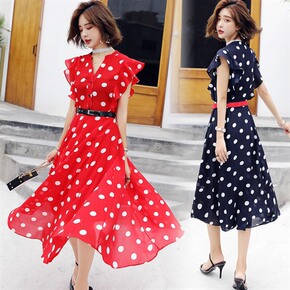 夏装新款一片式荷叶边V领系带收腰显瘦飞飞袖波点印花...