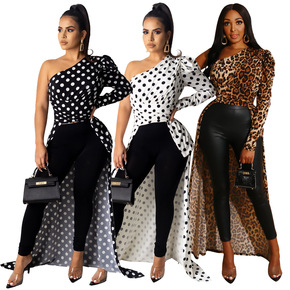 YM-8515 跨境热卖斜肩波点豹纹衬衫连衣裙 欧...