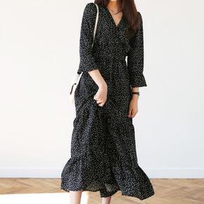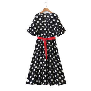 2019秋冬女装V领5分袖收腰大摆连衣裙波点现货女...