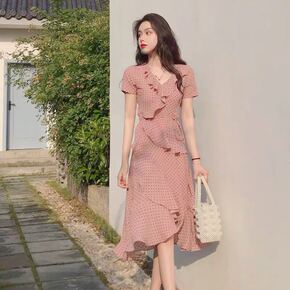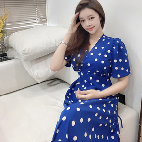 2020夏季新款台湾V领波点短袖连衣裙女收腰显瘦雪...