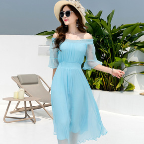 很仙的连衣裙 一字肩桑蚕丝长裙波西米亚海滩真丝松紧...
