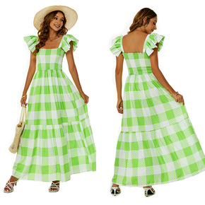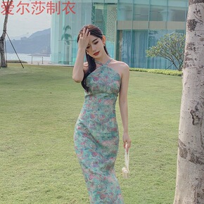 波西米亚长裙连衣裙2022夏季修身一字领露肩绿色格...