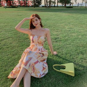 22夏季海边度假风印花复古肩带抹胸v领露肩高腰修身...