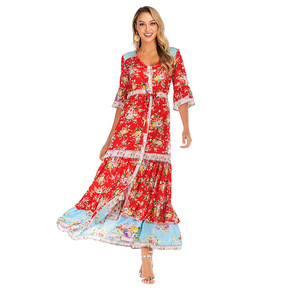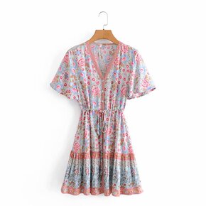 亚马逊跨境外贸欧美波西米亚抽绳V领印花连衣裙女装2...