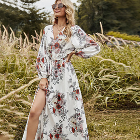 亚马逊跨境新款欧美雪纺树叶印花长裙法式绑带波西米亚...