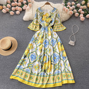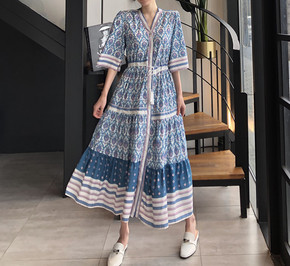 民族风连衣裙夏季女收腰显瘦气质长裙波西米亚海边度假...