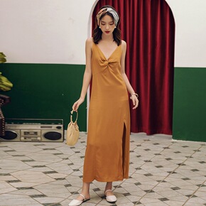 新款黄色雪纺碎花吊带连衣裙女高腰显瘦波西米亚沙滩长...