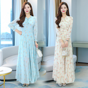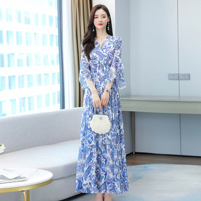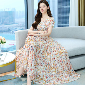 波西米亚雪纺碎花连衣裙女2021年新款长款过膝到脚...