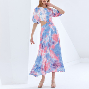 外贸2021春新品波西米亚风海边度假露腰扎染印花大...