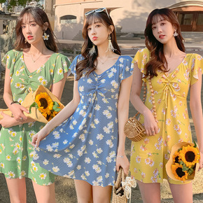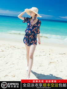 闪电新款亚马逊大码泳装女印花保守遮肚温泉裙式四角分...