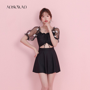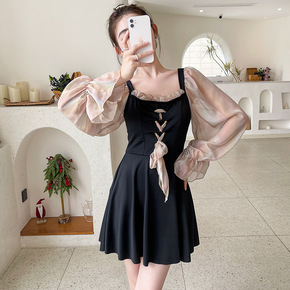 /黑色泡泡袖泳衣女夏连体遮肚显瘦保守ins风抽绳温...
