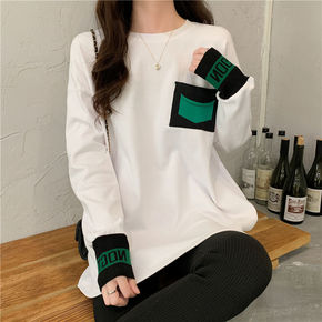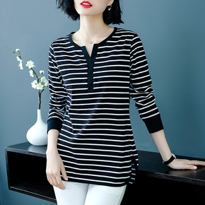 条纹t恤女长袖秋装中长款宽松纯棉大码中年妈妈秋衣时...