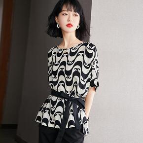 高端雪纺衫女夏季宽松遮肚子大码胖mm收腰系带洋气减...