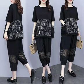 夏季宽松七分裤减龄两件套潮加肥加大码胖妹妹遮肚显瘦...