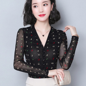2022春秋新款上衣网纱内搭打底衫洋气V领性感小衫...