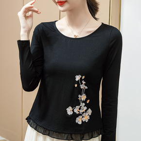 2022春季新款长袖修身短款t恤女 全棉洋气民族风...