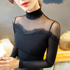 兰心格半高领蕾丝打底衫女春秋内搭长袖t恤洋气小衫勾...