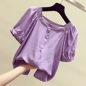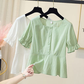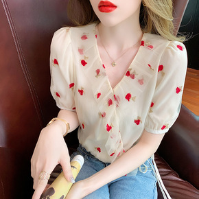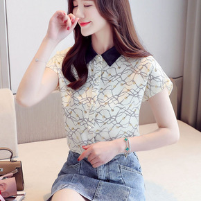 洋气雪纺衫衬衫女夏装新款撞色短袖打底衫小衫韩版白花...