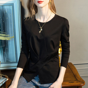 2022新款女装褶皱开叉t恤女长袖夏款设计感不规则...