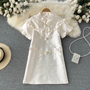 宫廷风连衣裙夏季爆款设计感撞色拼接娃娃领修身短款小...