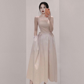 优雅气质法式洋装平口吊带露背收腰压折大摆连衣裙晚宴...