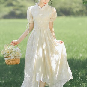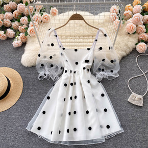 宫廷风小洋装名媛高端礼服女甜美波点减龄泡泡袖修身短...