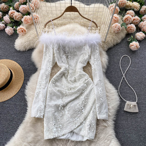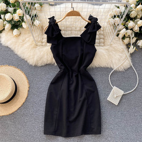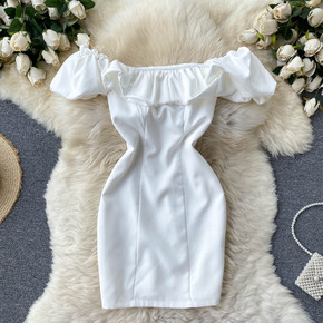 礼服小洋装名媛高端女装性感一字领露肩荷叶边修身短款...