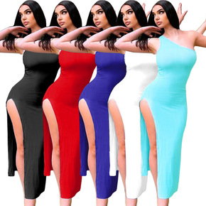 速卖通欧美跨境女装斜肩弹力性感紧身侧高开叉洋装礼服...