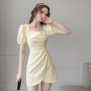 法式复古礼服气质洋装韩版方领泡泡袖珍珠链条露背皱褶...