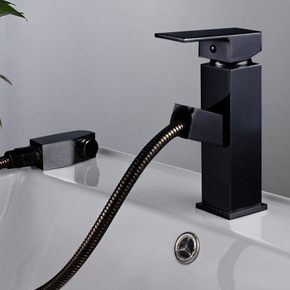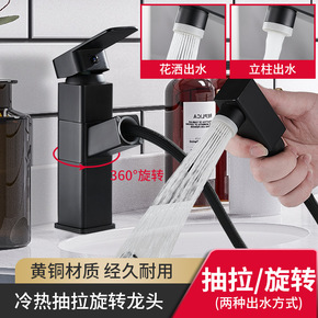 全铜抽拉式水龙头卫生间台盆洗脸盆洗手池黑色面盆水龙...