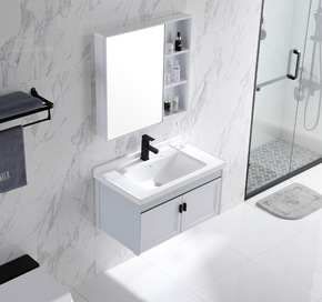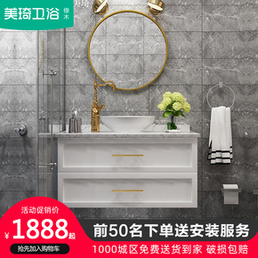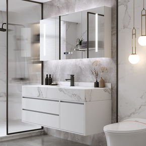 陶瓷一体盆浴室柜组合 智能镜柜轻奢石纹白洗漱台 美...