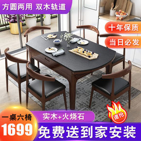 火烧石餐桌椅组合大理石餐桌椅全实木餐桌圆桌方圆两用...
