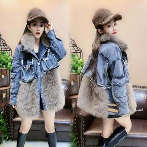 2022冬季新款韩版加棉厚牛仔拼接派克服大衣女真毛...