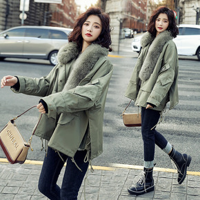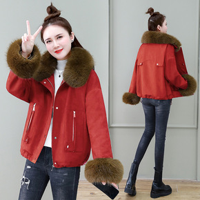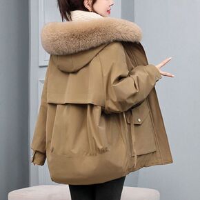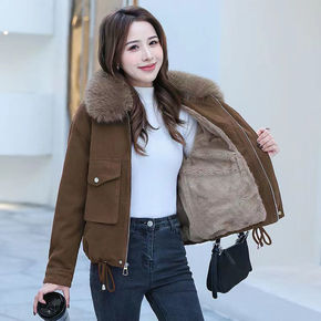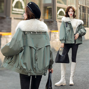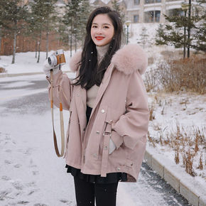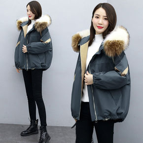 派克服女2021冬季新款时尚加绒加厚带毛领短款棉服...