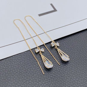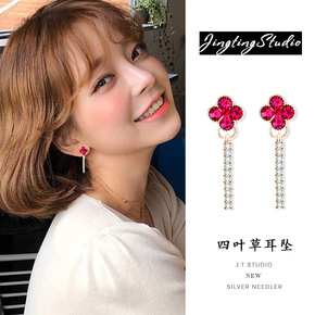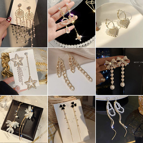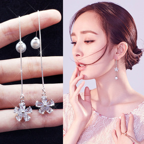 s925纯银针耳环韩国时尚气质长款耳钉女爱心水晶网...