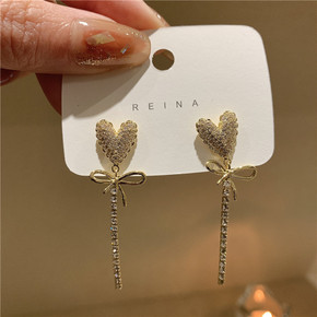 S925银针韩国复古爱心水钻流苏长款耳环 高级感小...