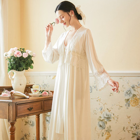 法式秋冬长袖睡袍羽毛白色时尚蝴蝶结睡衣缎面欧美长款...