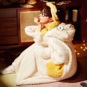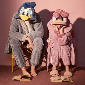 情侣冬加厚唐老鸭长毛绒连帽睡袍舒适保暖男女家居服网...
