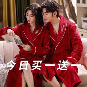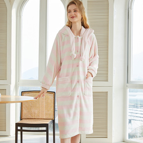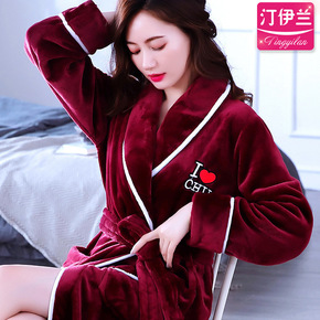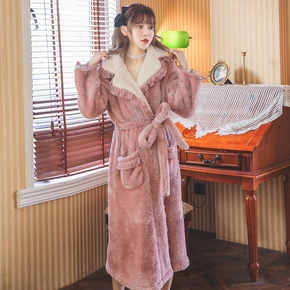 草莓夹棉睡袍法兰绒睡衣女秋冬长款珊瑚绒睡袍可爱加厚...