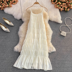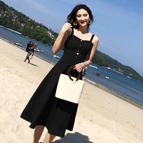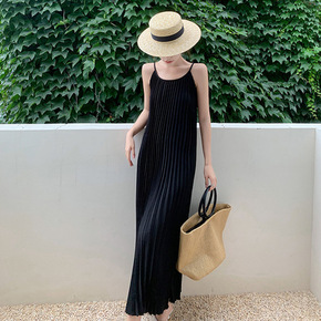 复古百褶气质宽松显瘦黑色吊带连衣裙小黑裙女夏海边度...