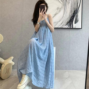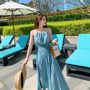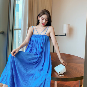 2022三亚海边旅游女人味二穿兰色压皱吊带裙女度假...