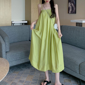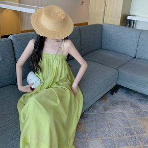牛油果绿吊带连衣裙夏无袖一字领露肩大摆长裙三亚海边...