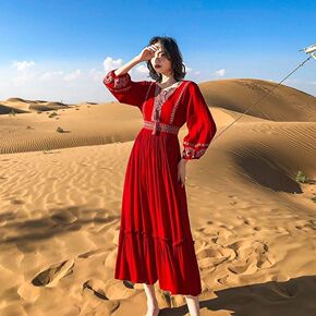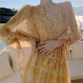 三亚沙滩裙超仙小心机波西米亚黄色拍照防晒长袖连衣长...