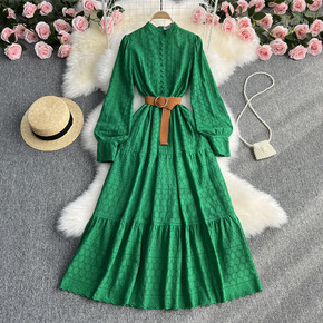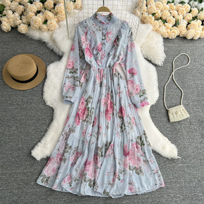 花边立领碎花雪纺连衣裙收腰显瘦海边度假沙滩裙收腰压...