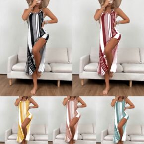 三亚海边度假沙滩裙女夏季新款V领条纹显瘦吊带连衣裙...